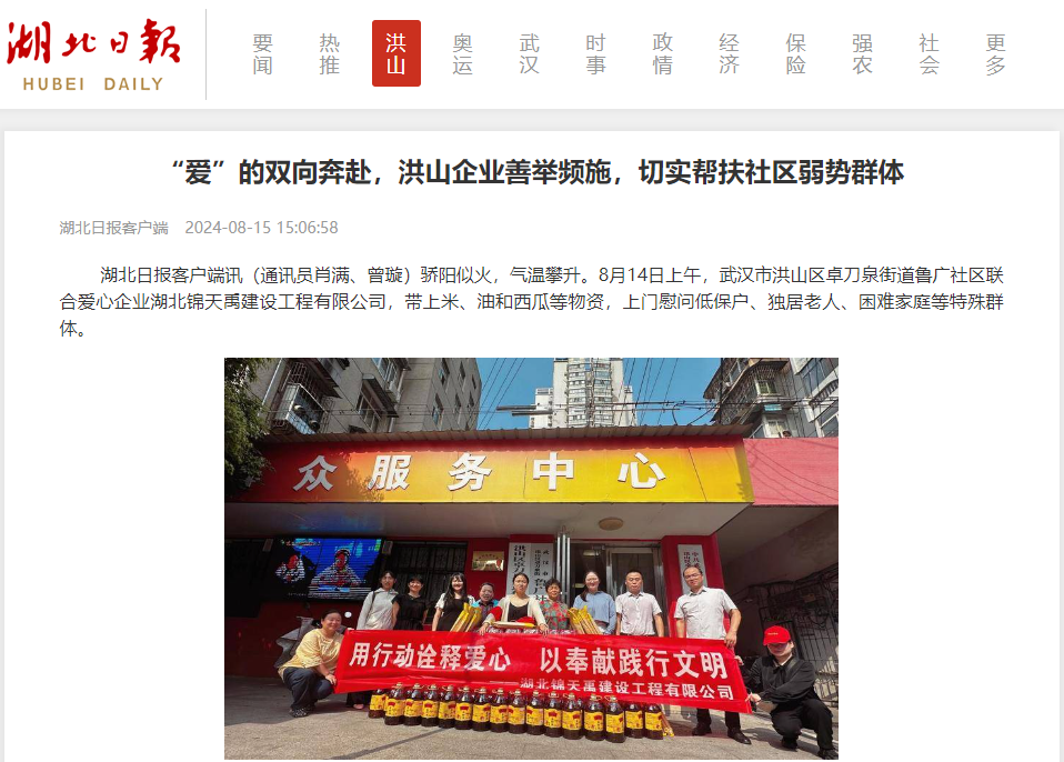 2024年8月14日,开云官方在线入口-开云(中国)党支部前往卓刀泉街道鲁广社区双塘小区,为孤寡老人送去温暖和关怀。8月15日,湖北日报以《“爱”的双向奔赴,洪山企业善举频施,切实帮扶社区弱势群体》为题,对我司此次志愿服务活动进行了表彰。以下为湖北日报原文及链接地址: