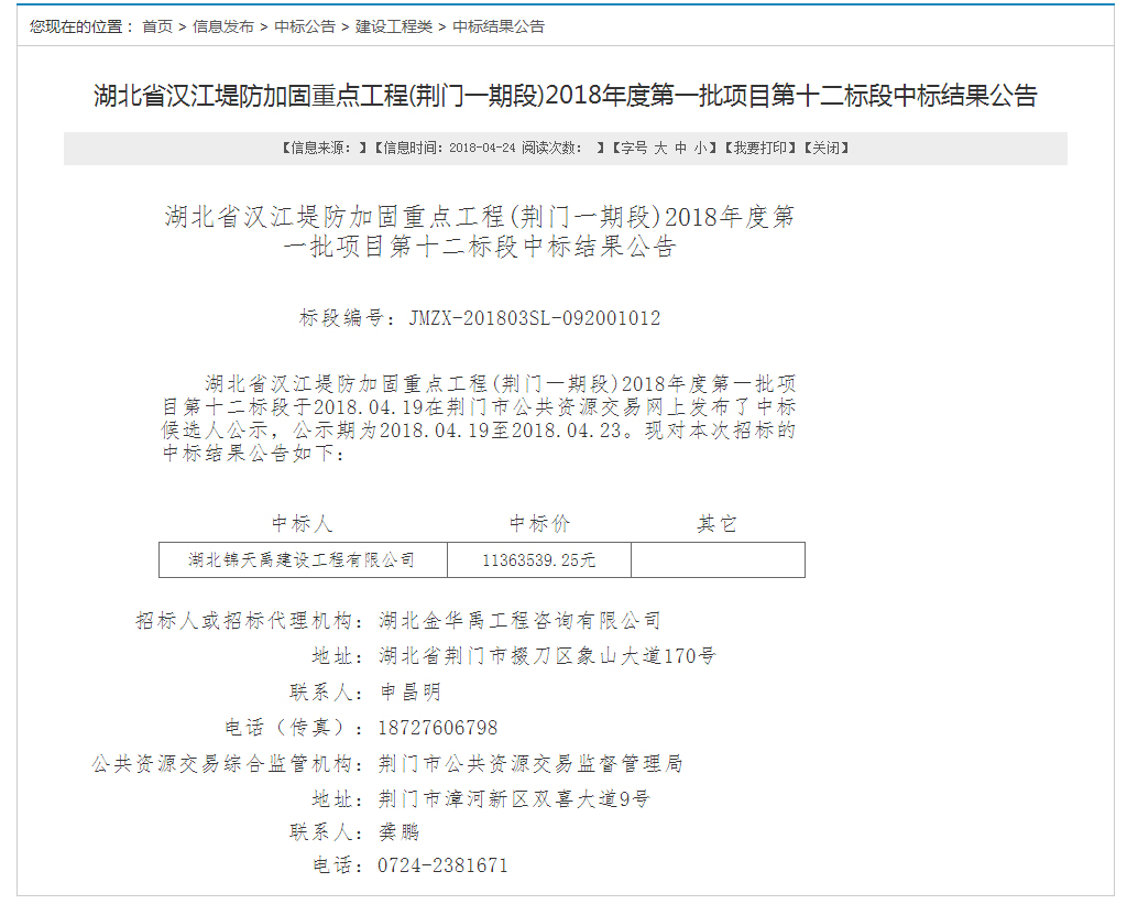 项目名称: 湖北省汉江堤防加固重点工程(荆门一期段)2018年度第一批项目第十二标段