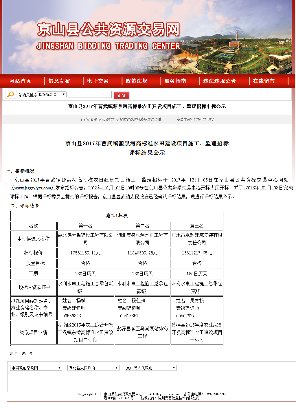 项目名称:京山县2017年曹武镇源泉河高标准农田建设项目施工一标段