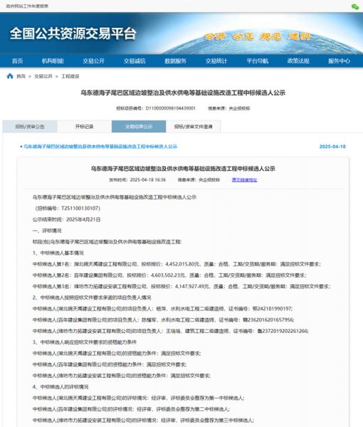 项目名称:乌东德海子尾巴区域边坡整治及供水供电等基础设施改造工程招标编码:T251100130107招 标 人:中国长江三峡集团有限公司相关网络截图:相关网络链接:乌东德海子尾巴区域边坡整治及供水供电等基础设施改造工程中标候选人公示