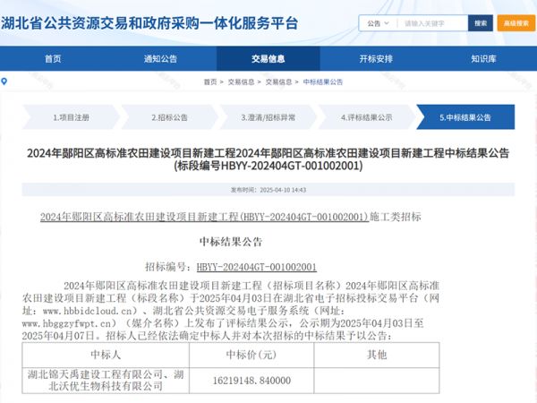 项目名称:2024年郧阳区高标准农田建设项目新建工程(联合体1) 招标编码:HBYY-202404GT-001002001招 标 人:十堰市郧阳区农业农村局相关网络截图:相关网络链接:2024年郧阳区高标准农田建设项目新建工程2024年郧阳