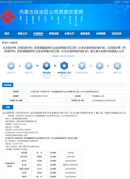 项目名称:北方防沙带(巴彦淖尔市)历史遗留废弃矿山生态修复示范工程(小佘太废弃铁砂金矿区)施工第三标段招标编码:K1508002024121801招 标 人:乌拉特前旗自然资源局相关网络截图:相关网络链接:北方防沙带(巴彦淖尔市)历史遗留废