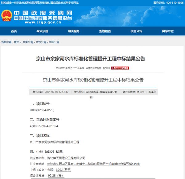 项目名称:京山市余家河水库标准化管理提升工程招标编码:HBLRX2024-055招 标 人: 京山市余家河水库管理处相关网络截图:相关网络链接:京山市余家河水库标准化管理提升工程中标结果公告