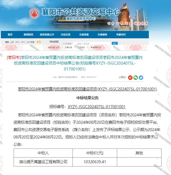 项目名称:枣阳市2024年省预算内投资高标准农田建设项目招标编码:XYZY-JSGC202407SL-017001001招 标 人: 枣阳市农业综合开发服务中心相关网络截图:相关网络链接:枣阳市2024年省预算内投资高标准农田建设