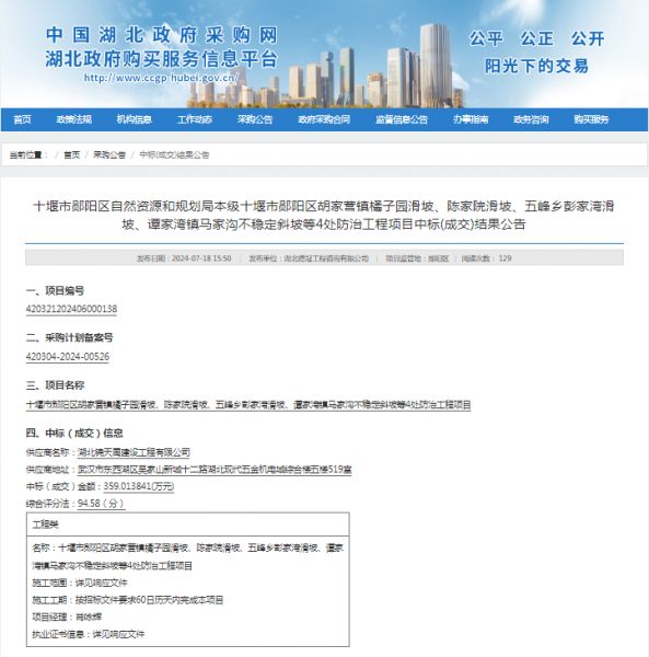 项目名称:十堰市郧阳区胡家营镇橘子园滑坡、陈家院滑坡、五峰乡彭家湾滑坡、谭家湾镇马家沟不稳定斜坡等4处防治工程项目招标编码:420321202406000138招标人:十堰市郧阳区自然资源和规划局本级相关网络截图:相关网络链接:十堰市郧阳区