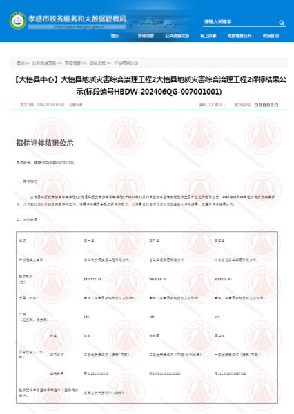 项目名称:大悟县地质灾害综合治理工程2招标编码:HBDW-202406QG-007001001招标人:大悟县自然资源和规划局相关网络截图:相关网络链接:大悟县地质灾害综合治理工程2评标结果公示