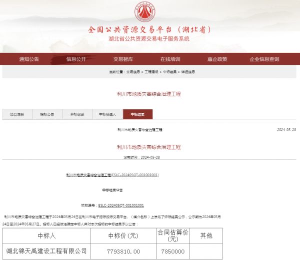 项目名称:利川市地质灾害综合治理工程招标编码:ESLC-202405QT-001001001招标人:利川市自然资源和规划局相关网络截图:相关网络链接:利川市地质灾害综合治理工程中标结果公告